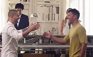 On August 23, 2016, Martin shared a selfie of himself and Maluma on the set of filming "Vente Pa' Ca" music video.[1] In the first images of the video, the singers were seen wearing fully white outfits and having fun next to a beautiful woman with brown hair.[97] The following day, Billboard announced that it would be released alongside the song on September 23, 2016.[2] The video was filmed at the SLS South Beach Hotel in Miami Beach, Florida, and directed by Dominican director Jessy Terrero, who had previously directed the videos for Martin's singles "Adrenalina" and "Que Se Sienta El Deseo".[2][98] The visual begins with Martin and Maluma accidentally running into each other while at a luxurious hotel. After sharing a selfie together on social media, the two singers host a beach party at the SLS South Beach Hotel, which has a Miami-style. It includes several parties in different locations of the hotel, comprising a rooftop soiree and a pool party.[2][21][99] Cristal Mesa from mitú named the visual Martin's seventh best music video on her 2018 list,[100] and an author of Cultura Colectiva listed it among the "13 Videos to Appreciate Ricky Martin's Talent and Sickening Good Looks".[30] As of September 2018, the visual has received over 1.4 billion views on YouTube, making it the ninth most viewed Spanish-language video of all time.[101]