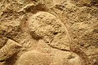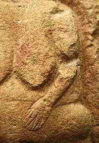 The Venus of Laussel is an 18.11-inch-high (46.0-centimetre) limestone bas-relief of a nude woman. It is painted with red ochre and was carved into the limestone of a rock shelter (Abri de Laussel) in the commune of Marquay, in the Dordogne department of south-western France. The carving is associated with the Gravettian Upper Paleolithic culture (approximately 25,000 years old). It is currently displayed in the Musée d'Aquitaine in Bordeaux, France.