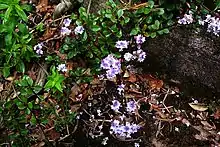 Veronica hulkeana, synonym Hebe hulkeana, the New Zealand lilac,[2] is a species of plant in the Plantaginaceae.[1] Its pale mauve flowers are on long sprays, which develop from the tips of the branches. The dainty flowers, which occur in profusion, last from October until December. The foliage is dark green and shiny. The leaves are elliptic to obtuse in shape and are 7โ10 cm long and 2โ3 cm wide. This cold-hardy plant is easy to grow, providing it has well drained, light soil and an open, sunny position. Its natural habitat is in dry rocky places in the northern part of the South Island up to an altitude of 900 m.