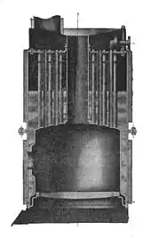 The relatively rare Fowler steam wagons used a boiler of this form.[4] The main barrel of the boiler contained a nest of curved firetubes between the stayless firebox and a large open space that formed a smokebox containing a five-turn spiral tube superheater. Both tubeplates were domed inwards, making them strong enough to not require staying. The firetubes were curved to 'cause eddies in the hot gases as they rise',[4] to allow for free expansion with heat and also to allow a perpendicular joint between tube and tubeplate.
