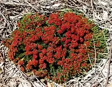 The flowers are mouse-scented, arranged corymb-like groups with each flower on a stalk 1–2 mm (0.04–0.08 in) long. They are lemon-yellow and red, golden-yellow and orange to bronze, or deep red. The floral cup is broadly top-shaped, about 0.8 mm (0.03 in) long, hairy and more or less smooth. The sepals are yellow to dark red, about 1.7 mm (0.07 in) long, with 4 lobes which have long-hairy ends. The petals are about 1 mm (0.04 in) long, broad egg-shaped with a finely toothed margin, shiny yellow to dark red. The style is 4.0–5.5 mm (0.16–0.22 in) long, straight or gently curved with a few short hairs. Flowering time is from January to July.[3]