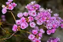 The flowers are arranged in rounded groups on stalks 2–15 mm (0.08–0.6 in) long near the ends of the branches. The floral cup is broadly top-shaped, about 1.5 mm (0.06 in) long, glabrous but slightly rough. The sepals are pink, sometimes white, 3–3.5 mm (0.12–0.14 in) long, with 5 to 7 hairy lobes. The petals are also pink or white, and are 2.5–3.0 mm (0.098–0.12 in) long, egg-shaped with long, coarse hairs. The style is 0.2–0.4 mm (0.008–0.02 in) long, straight and glabrous. Flowering time is from November to December or January.[3]