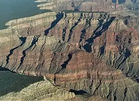 The summit of Vesta Temple is composed of Permian Kaibab Limestone and Toroweap Formation overlaying cream-colored, cliff-forming, Permian Coconino Sandstone.[7] The sandstone, which is the third-youngest of the strata in the Grand Canyon, was deposited 265 million years ago as sand dunes. Below the Coconino Sandstone is reddish, slope-forming, Permian Hermit Formation, which in turn overlays the Pennsylvanian-Permian Supai Group.[8] Further down are strata of the conspicuous cliff-forming Mississippian Redwall Limestone, the Cambrian Tonto Group, and finally granite of the Paleoproterozoic Vishnu Basement Rocks at river level in Granite Gorge. Precipitation runoff from Vesta Temple drains northeast to the Colorado River via Topaz Canyon and Boucher Creek.