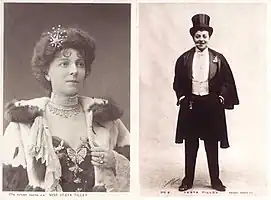 Tilley was known for her painstaking attention to detail in preparing for her roles: she wore her hair tightly plaited and hidden under a wig; she took to wearing men's underwear so her appearance looked believable, since contemporary women's underclothing would have distorted her shape.[9] Her performances were always family-friendly, unlike other acts.[2] She had found her niche, performing as a male impersonator and working-class men adored her mockery of the upper classes. From the 1870s onwards, women also went to music halls and they revelled in Tilley's independence.[10] By 1912, music hall entertainments had become so famous that a Royal Command Performance was organised.[2] Tilley sang a favourite song, "The Piccadilly Johnny with the Little Glass Eye" wearing trousers as part of her act. Queen Mary was scandalised to see a woman's legs and hid her face behind a programme.[3]