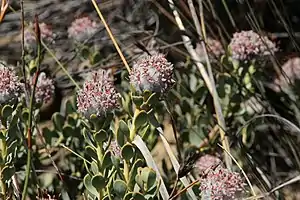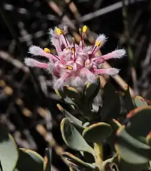 Vexatorella amoena, also known as the Swartruggens vexator is an evergreen shrub of up to about 1 m (3 ft) high, that is assigned to the family Proteaceae. It has entire, inverted egg-shaped, bluish grey, leathery leaves of 1½–3 cm (0.6–1.2 in) long and 5–11 mm (0.20–0.45 in) wide on a distinct stalk, and globular flower heads of about 2 cm (0.8 in) across with pale pink flowers with extended, thick-tipped styles at the tip of the branches. The plants are flowering from September to November. It is an endemic species that is restricted to the Western Cape province of South Africa.[3]