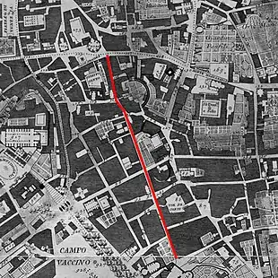 The first modern urban planning in the area between the Forum of Nerva and the Trajan's Column took place around 1570 thanks to Cardinal Michele Bonelli. He arranged to reclaim the area and make it buildable and traced the street, called Alessandrina from his nickname. The street cut through the ancient Argiletum reaching the Temple of Peace (beyond today's Via Cavour).[1]