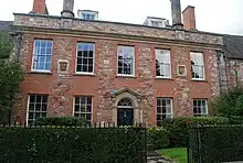 The residences are built of stone from the Mercia Mudstone Group.[10] There were originally 22 houses on the east side and 20 on the west. They line each side of a quadrangle which appears longer than it is because of false perspective achieved by building the houses at the upper northern end nearest the chapel 9 feet (2.7 m) closer together than those at the lower southern end closest to the Vicars' Hall.[16] Each house originally comprised a ground floor hall of approximately 20 by 13 feet (6.1 by 4.0 m) and an upper floor of the same size.[6][7][18] Both had a fireplace in the front wall. Washing facilities and a latrine were outside the back door.[18] The date of some of the buildings is unclear but it is known that some had been built by 1363 and the rest were completed by 1412.[17] There were originally 42 houses, each for one vicar; however, a charter of c.1582 Queen Elizabeth restricted the number of vicars to twenty,[14] and the Vicars Choral currently number twelve men.[24] No. 1 Vicars' Close was once a larger property, but has since been divided and part of the building is now called No. 1 St. Andrew Street.[25]