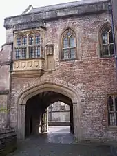 The Chain Gate, built with Doulting stone, was abutted to the hall in 1459 by Thomas Beckington. This included a gallery over the gate into the cathedral for the vicars' convenience.[20]