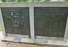 The Victoria Cross for New Zealand is identical to the original design.[7] The decoration is a cross pattée, having straight edges and approximately 36 millimetres (1.4 in) square, bearing a crown surmounted by a lion, and the inscription "For Valour". The cross is suspended by a ring from a seriffed "V" to a bar ornamented with laurel leaves, through which the ribbon passes. The reverse of the suspension bar is engraved with the recipient's name, rank, number and unit. On the reverse of the medal is a circular panel on which the date of the act for which it was awarded is engraved in the centre. The ribbon is crimson, 38 millimetres (1.5 in) wide.[9][10]