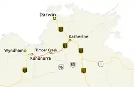 The Victoria Highway links the Great Northern Highway in Western Australia with the Stuart Highway in the Northern Territory.[1] The highway is a part of the Perth–Darwin National Highway link. It is signed as National Highway 1, and is part of Highway 1, a circular route around the country. It is 555 kilometres (345 mi) long, and most of the route – some 470 kilometres (290 mi) – lies within the Northern Territory. In some areas it runs in parallel with the Northern Territory's Victoria River, from which its name originates.