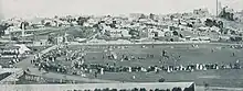 A park located west of the Auckland central city was mooted at a Council meeting in 1884.[1] Victoria Park opened in 1905 by mayor Arthur Myers, after the reclamation of Freemans Bay was completed.[2][1] The artificial creation of the land is why it is very flat and level – it was intended from the start to be primarily a facility for active events augmenting the other public parks; Western Park 1876 and Albert Park 1884 which were for more genteel passive enjoyment. For this reason the park was not laid out in a picturesque manner, neither has it ever had decorative flower beds. The first grandstand pavilion was opened in 1906.[1] As a sports facility for the adjacent working class areas and industrial zones it was provided with a sports pavilion and edged with trees to give shade for spectators. These are London plane trees (planted in 1905 for the opening of the park),[3]