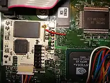 The motherboard of an original Xbox, with a Xenium ICE modchip installed
