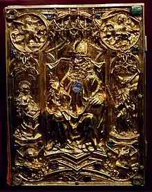 The Vienna Coronation Gospels, also known simply as the Coronation Gospels (German: Krönungsevangeliar), is a late 8th century illuminated gospel book produced at the court of Charlemagne in Aachen.[1] It was used by the future emperor at his coronation on Christmas Day 800, when he placed three fingers of his right hand on the first page of the Gospel of Saint John and took his oath.[2] Traditionally, it is considered to be the same manuscript that was found in the tomb of Charlemagne when it was opened in the year 1000 by Emperor Otto III. The Coronation Evangeliar cover was created by Hans von Reutlingen, c. 1500.[2][3] The Coronation Evangeliar is part of the Imperial Treasury (Schatzkammer) in the Hofburg Palace in Vienna, Austria (Schatzkammer, Inv. XIII 18).[3]