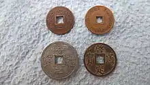The cash (chữ Hán: văn tiền; chữ Nôm: đồng tiền; French: sapèque),[lower-alpha 1][lower-alpha 2] also called the sapek or sapèque,[lower-alpha 3] is a cast round coin with a square hole that was an official currency of Vietnam from the Đinh dynasty in 970 until the Nguyễn dynasty in 1945, and remained in circulation in North Vietnam until 1948. The same type of currency circulated in China, Japan, Korea, and Ryūkyū for centuries. Though the majority of Vietnamese cash coins throughout history were copper coins, lead, iron (from 1528) and zinc (from 1740) coins also circulated alongside them often at fluctuating rates (with 1 copper cash being worth 10 zinc cash in 1882).[7] Coins made from metals of lower intrinsic value were introduced because of various superstitions involving Vietnamese people burying cash coins, as the problem of people burying cash coins became too much for the government. Almost all coins issued by government mints tended to be buried mere months after they had entered circulation. The Vietnamese government began issuing coins made from an alloy of zinc, lead, and tin. As these cash coins tended to be very fragile, they would decompose faster if buried, which caused the Vietnamese people to stop burying their coins.[8][9]