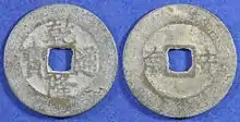The first Vietnamese coins were cast under the rule of the Đinh dynasty (968–981) with the introduction of the Thái Bình Hưng Bảo () under Đinh Bộ Lĩnh.[16] Likewise the only inscription cast during the Early Lê dynasty period bore the inscription Thiên Phúc Trấn Bảo (天福鎮寶).[15][17] However, for the next two centuries coins would remain a rarity in the daily lives of the common people, as bartering would remain the dominant means of exchange under both the Đinh and Early Lê dynasties.[18]