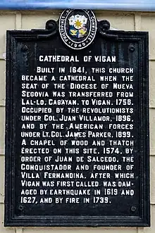 The first church was built in 1641[5] and was damaged by earthquake in 1619 and 1627. A third church was burned in 1739. Upon the request of then Bishop Juan de la Fuente Yepes, the seat of the Diocese of Nueva Segovia was transferred from Lal-lo, Cagayan to Ciudad Fernandina de Vigan (present-day Vigan) through a ceremonial procession on September 7, 1758.[6] With the transfer of the seat of the Diocese, the church of Vigan became a cathedral on that same year. Governor General Jose de Basco ordered the establishment of a new church in 1786. The fourth and present-day church was built from 1790 to 1800 under the Augustinians.[7] It was occupied by the revolutionists under Colonel Juan Villamor in 1896 and by the American forces under Lieutenant Colonel James Parker in 1899.[2]
