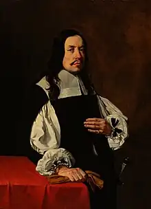 Boucquet had a refined technique which he put to use in his portraits. One of his most famous paintings The Standard Bearer (1664, Louvre) is signed 'Vigor Boucquet' and dated 1664. The work is traditionally believed to represent a person in military uniform. The standing figure holds over his shoulder a multicolored flag. On his armor, crossed by a red scarf fringed with gold, is spread a broad lace collar. His tunic of yellow leather covers a skirt in brown violet. The sleeves of his shirt are finely pleated. He wears blue stockings and a hat with white feathers is placed on a pedestal next to him. The swarthy complexion of the face, framed by long black hair, seems to denote a Spaniard. The countess of Comminges-Guitaud, who donated the painting to the Louvre, had bought the painting in Spain, which would point again to a Spanish sitter.[2] There is, however, no firm evidence that the depicted person is a Spaniard garrisoned in Veurne. It is very well possible that the portrait depicts a member of a local civic guard or a company of archers.[7]
