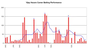 Hazare was the leading run scorer of 1939–40 Ranji Trophy season. His team Maharashtra won its first title in that season, they defeated United Province cricket team in the final at Poona (Now Pune).[4] In 1940–41 Ranji trophy he made 100 in the final and took 2 wickets. Maharashtra won the that season by defeating Madras cricket team in the final. Since that season Maharashtra not able to won Ranji trophy again.[5]