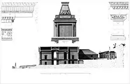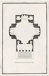 Palladio planned the villa on low lines extending into a large park. The ground floor plan is complex: rectangular with perpendicular rooms on a long axis, the central block projects and contains the principal reception room. The central block, which is designed to resemble the portico of a Roman temple, is decorated by four Ionic columns, a motif which takes its inspiration from the Temple of Fortuna Virilis in Rome. The central block is surmounted by a large pediment with heraldic symbols of the Barbaro family in relief.[6] Below the pediment is a Latin inscription on the entablature dedicating the villa to the brothers' father; the inscription translates, "Daniel Barbaro, Patriarch of Aquileia, and Marcantonio his brother, sons of Francesco Barbaro".[7]