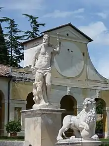 The land originally belonged to the Arbil and then the Giustiniani families, before becoming property of the Barbaro family. Authorities vary as to the dates given for the building of the villa. The architectural historian Adalbert dal Lago states it was built between 1560 and 1570,[1] while others state that the villa was mostly completed by 1558.[2] Hobson[3] concurs with dal Lago that the date of commencement was probably 1560. By this date Palladio had provided the illustrations for one of Daniele's publications, a commentary on the writings of the Roman architect Vitruvius. Hobson credits Daniele with the idea of not only building the villa but also the choice of architect and the sculptor Alessandro Vittoria. While Daniele was better-known as a connoisseur of the arts, it was for the use of Marcantonio's family and descendants that the villa was intended in the long term.[4]