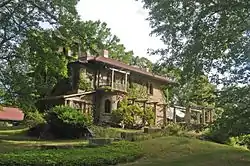 Villa Bella Vista is located east of the village center of Chester, on the north side of Old Depot Road just east of Connecticut Route 154. It is a large two-story structure, set on a hill overlooking the Connecticut River. It is built out of concrete faced in stuccoed stone, with a three-story tower at the northwest corner, which (like the main roof) has a shallow pitch with deep overhangs. The east side of the house has an open piazza sheltered by pergolas, with French doors providing access to the piazza from the house. There are several second-floor balconies, one of which is accessed by doors having Gothic pointed arches.[2]