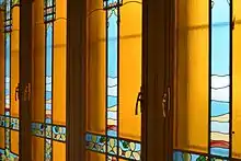 Like the exterior, the interior is in the Art Nouveau style. The main stairwell is dominated by a three section stained glass wall that lets light and colour in. The figurative portion of the design is made up of small coloured glass panels held together by a metal framework.