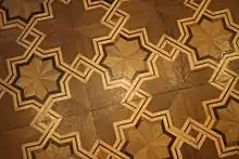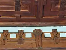 The wrought iron elements are probably the result of a collaboration between Campanini and Alessandro Mazzucotelli. This hypothesis is corroborated by some preliminary sketches for the architect's own home, found in Mazzucotelli's archive, by the high quality of the Villa's decorative elements, and by their affinities with contemporary works by the artist.[7] Villa Bernasconi has many wrought iron fixtures (the fence, the banisters, the balcony railings, some window frames) in a plethora of different motifs: wide, fleshy leaves, Secession-style graphic elements for the backstairs banisters, roses and tendrils for the main staircase.
