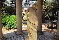 The garden à la française is the largest and occupies the area behind the villa. Next to the villa there is a terrace with a formal French garden and topiaries. Beyond the terrace is a park with palm trees and a long basin, ornamented with fountains, statues, and basins with water lilies and other aquatic plants. On the far end of the park is a hill covered with cypress trees, surrounding a replica garden of the Temple of Love at the Petit Trianon palace in Versailles. The slope below the temple has a cascade of water in the form of a stairway, which feeds into the large basin.