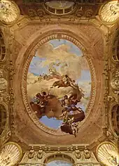 • The top band contains architectural trompe-l'œil, which gives a sense of perspective to the whole. The lateral monochrome paintings are of statues representing Abundance and Justice. The satyrs above the doors evoke the four seasons.