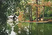 By the end of the 18th century, Romanticism, the fashion of the time, had spread to Verona. English-style gardens began to appear – rolling landscapes, exotic plants, meandering paths, hidden corners with faux archaeological ruins – instead of the Italian style, which was predominantly green and ordered. Following this trend, the brothers Giacomo and Guglielmo Mosconi reshaped the land behind the house, giving it two prominent features, a garden and a small wooded area. They built the pond, fed by springs located on the property with an island in the center, accessed by a wooden bridge. The island was planted with tall Taxodium trees, conifers in the cypress family. The brothers also constructed a coffeehouse inspired by similar Northern European buildings on the edge of the pond, facing the island.