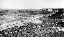 The first known mention of the area was an entry in the diary of Colonel Manuel José Olascoaga, an officer in the Argentine army. On June 4, 1879, during the Conquest of the Desert,[1] Olascoaga described it while camping with his troops: "Two hours on the way up from Chichinal, we camped on a place a bit far from the river, close to a water reservoir. [...] The ground is plain with ligere landforms. The canyons to the north increase their altitude westbound."[2] During the expansion of the Buenos Aires Great Southern Railway (Spanish: Ferrocarril del Sur) to the lands conquered during the Desert Campaign, the new route passed by the area because it was flat.[1] Manuel Marcos Zorilla, the private secretary of president Julio Argentino Roca, was given 15,000 hectares there, which he called Zorilla Field (Spanish: Campo Zorilla).[1] Zorrilla officially received the lands in 1895, with the condition that he would have to cede, free of charge, the sections where the tracks of the Ferrocarril del Sur would be built.[3]