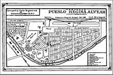 The colony was established on November 7, 1924, and was initially named Colonia Regina de Alvear, in honor of the first lady, Regina Pacini de Alvear.[9] Héctor Valsecchi was named the first president of the company.[1] Bonoli and his helper, Emilio Bignami, planned the organization and development of the area.[10] The company spent most of its starting capital of US$1.4 million buying the 5,000 hectares. During the first year, they worked 1,300 hectares, which were divided into lots of 5, 10 and 15 hectares. To settle this area, the company gave preference to the Italian immigrants that already lived in Argentina. During the second stage, the company cultivated 1,200 hectares; these were given to Italian families that wanted to immigrate to Argentina. Those in this second wave of settlement were selected by the officials of the company. By 1927, 1,000 people had settled in the town.[11] Soon a hospital, a church, a school, a library and a sports club were built. The Bank of Rome gave the settlement a loan of 5 million lire, in spite of Benito Mussolini's plan to use that money to support Italian workers in Italy.[12] Further loans to the settlement were leveraged by Bonoli's connection to Ottavio Dinale. Dinale, a collaborator of Mussolini, had influence with the General Commissariat of Emigration (Italian: Commissariato Generale dell'Emigrazione). The loans were given by the Banca Commerciale Italiana, through the Francés y Italiano para América del Sur bank and the Italia y Río de la Plata bank.[13]
