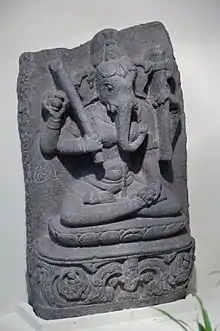 A Pala Vinayaki from Giryek, Bihar, is also not pot-bellied. The four-armed goddess carries a gada (mace), ghata (pot), parashu (axe) and possibly a radish. A Pratihara image shows a pot-bellied Vinayaki, with four arms holding a gada-parashu combination, a lotus, an unidentifiable object and a plate of modak sweets, which the trunk grabs. In both images, the trunk is turned to the right.[8] Damaged four-armed or two-armed Vinayaki images are also found in Ranipur Jharial (Orissa), Gujarat and Rajasthan.[8]