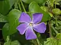 The closely related Vinca minor is similar but smaller, with narrower, hairless leaves.
