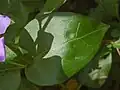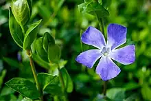 Vinca major, with the common names bigleaf periwinkle, large periwinkle, greater periwinkle and blue periwinkle, is a species of flowering plant in the family Apocynaceae, native to the western Mediterranean. Growing to 25 cm (10 in) tall and spreading indefinitely, it is an evergreen perennial, frequently used in cultivation as groundcover.