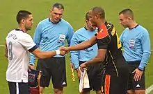 On 19 May 2010, Kompany captained Belgium for the first time and scored his first international goal in the 90th minute for a 2–1 friendly win over Bulgaria at the King Baudouin Stadium.[66] After 34 minutes of Belgium's 2–1 World Cup qualifier win against Serbia in June 2013, Kompany suffered concussion and facial injuries, including a broken nose and cracked eye-socket, in a collision with goalkeeper Vladimir Stojković. After receiving first aid on the touchline, he played out the remainder of the match.[67]