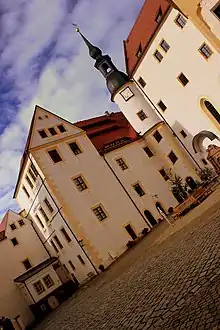 On 22 June 1943 Eichstätt tunneller Jack Champ arrived at Oflag IV-C (Colditz).[14] Reinhold Eggers and his security staff processed Champ the following day. A protocol required a photograph of Champ with his prison number. In the Schloss, a guard had to chaperone a civilian worker, at all times. Lags goon baited the protocol. Three water bombs from the third and fourth floors hit the cobbled floor. Splashes soaked Champ, his comrades and the civilian cameraman...[15] This angered the guard... The guard and the cameraman rushed up the staircase. On the third and fourth floors, they tried to arrest those culpable.