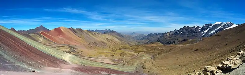 Vinicunca, or Winikunka, also called Montaña de Siete Colores (literally: Mountain of seven colors), Montaña de Colores (Mountain of colors) or Montaña Arcoíris (Rainbow Mountain), is a mountain in the Andes of Peru with an altitude of 5,200 metres (17,100 ft) above sea level.[1][2] It is located on the road to the Ausangate mountain, in the Cusco region, between Cusipata District, province of Quispicanchi, and Pitumarca District, province of Canchis.[3]