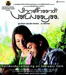 Vinnaithaandi Varuvaayaa (transl.Will you cross the skies for me?) is a 2010 Indian Tamil-language romantic drama film written and directed by Gautham Vasudev Menon, starring Silambarasan and Trisha. Jointly produced by Elred Kumar, Jayaraman, VTV Ganesh and P. Madan under the banner Escape Artists Motion Pictures and RS Infotainment, the film was distributed by Udhayanidhi Stalin's Red Giant Movies. The story was simultaneously shot in Telugu as Ye Maaya Chesave, starring Naga Chaitanya and Samantha, however, with a different cast.[1]