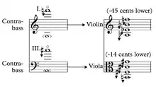 - 1 violin with scordatura (all strings 69 cents higher than normal, wherein the violin's string I tuned to the 7th harmonic partial of the contrabass's string I)[lower-alpha 1]