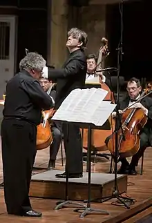 While composing the concerto, Ligeti originally planned an eight-movement work. Parts of the music for the unfinished movements were used by Gawriloff and Ligeti for the cadenza in the final movement,[4] which Ligeti asks the performer to devise as an alternative to the already existing cadenza. Composers who have composed cadenzas for the concerto include John Zorn,[5][6] Thomas Adès,[7] and Patricia Kopatchinskaja.