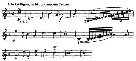 - The opening movement, which is in sonata form, is conceived more on symphonic than concertante lines. Its powerful opening subject dominates the proceedings, and although the violin’s role is extremely taxing, its subordination to a "symphonic" scheme is emphasized by the fact that there is no cadenza.
