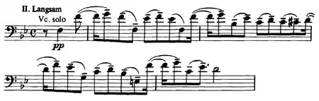 - The second movement, in B flat, has the character of an intensely lyrical intermezzo, the theme of which hints toward the Geistervariationen WoO 24, and passes without pause into the third movement. Until its penultimate bar this movement uses no wind except bassoons and trumpet.
