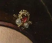 Both figures in the central panel have gilded halos. Mary is shown as be very young, likely no older than 15. She has blue green-eyes and reddish blond hair which is decorated with a green striped headband studded with an ornament jeweled with a ruby, two pearls and a diamond. She wears a long blue mantle which veils her face and drapes over her purple under-dress and blue fur-lined dress. The fur line extends beneath the child. The child has short blond hair and blue eyes, and is cradled by Mary's hand; her long fine fingers are shown reaching under his legs and across the lower chest. He is shown sitting on white cloth, toying with a string of red coral rosary beads which cast a shadow over his chest. The beads are strung on a green chord which drapes over his shoulder.[7] At the time coral was used to protect children from evil spirits.[2]