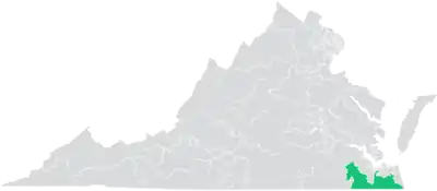 The district overlaps with Virginia's 2nd, 3rd, and 4th congressional districts, and with the 21st, 64th, 75th, 76th, 77th, 78th, 79th, 80th, 81st, and 84th districts of the Virginia House of Delegates.[4] It borders the state of North Carolina.[1]