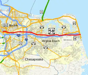 Virginia Beach Boulevard is a major connector highway which carries U.S. Route 58 most of its length and extends from the downtown area of Norfolk to the Oceanfront area of Virginia Beach, passing through the newly developed New Urbanist Town Center development of the latter as it links the two independent cities in the South Hampton Roads subregion of the Hampton Roads region in southeastern Virginia.