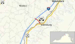 SR 185 begins at a three-way intersection at the southern end of SR 686 (South Ox Road) just west of Edinburg. The road continues west as SR 675 (Stoney Creek Road); that secondary highway has a signed concurrency with SR 185, although the secondary highway is not officially part of the primary highway. SR 185 heads southeast through a diamond interchange with I-81 and enters the town of Edinburg running parallel to Stony Creek to the south. The state highway has a grade crossing of Norfolk Southern Railway's B-Line before reaching its eastern terminus at US 11 (Main Street) at the west end of downtown Edinburg.[1][2]