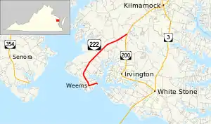 State Route 222 (SR 222) is a primary state highway in the U.S. state of Virginia. Known as Weems Road, the state highway runs 4.17 miles (6.71 km) from Weems north to SR 200 near Irvington in southern Lancaster County.