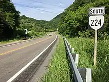 SR 224 begins at the Tennessee state line at Wadlow Gap, a wind gap in a low range of hills between Carter Valley to the north and the larger valley to the south that contains Kingsport. Wadlow Gap Road continues south toward that city as SR 93. SR 224 heads north and crosses the Carter Valley, then crosses Long Ridge before crossing the North Fork Holston River. The state highway veers west and curves back east around Pine Ridge before reaching its northern terminus at US 58 and US 421 (Hilton Road) a short distance to the east of Moccasin Gap on the eastern edge of the town of Weber City, where US 58 and US 421 intersect US 23.[1][2]