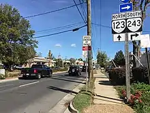 SR 243 begins at an intersection with US 29 and SR 237 (Lee Highway) between the independent city of Fairfax and the community of Merrifield. Nutley Street continues south 0.51 miles (0.82 km) as a two-lane undivided road designated SR 10272 to US 50 (Arlington Boulevard). SR 243 heads north as a six-lane divided highway through a cloverleaf interchange with I-66 just east of the Vienna station of the Washington Metro, which is the western terminus of the Orange Line that runs in the median of the Interstate from Vienna east to Arlington. Access to the station is provided by the first intersection on either side of the I-66 interchange. SR 243 continues into the town of Vienna as a four-lane divided boulevard that passes between residential neighborhoods before reaching its northern terminus at SR 123 (Maple Avenue) southwest of downtown Vienna. Nutley Street continues north as a two-lane residential street for four blocks to Malcolm Road.[1][2]
